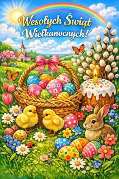 z okazji Świąt Wielkanocnych składamy Wam najserdeczniejsze życzenia: dużo radości, spokoju oraz nadziei płynącej z budzącej się do życia wiosny. Niech ten wyjątkowy czas będzie pełen ciepła, rodzinnych spotkań, uśmiechu i życzliwości.