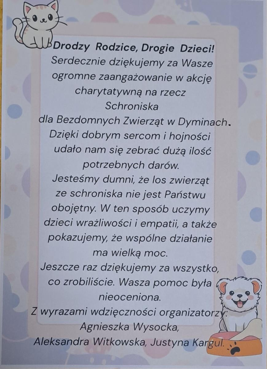 Podczas uroczystego podsumowania akcji odbyło się wręczenie dyplomów i podziękowań dla wszystkich uczestników, którzy okazali wielkie serce i wrażliwość na potrzeby zwierząt. ♥️