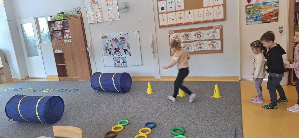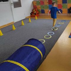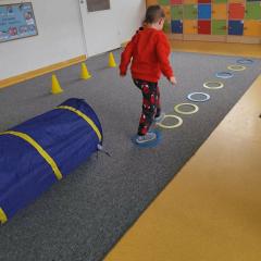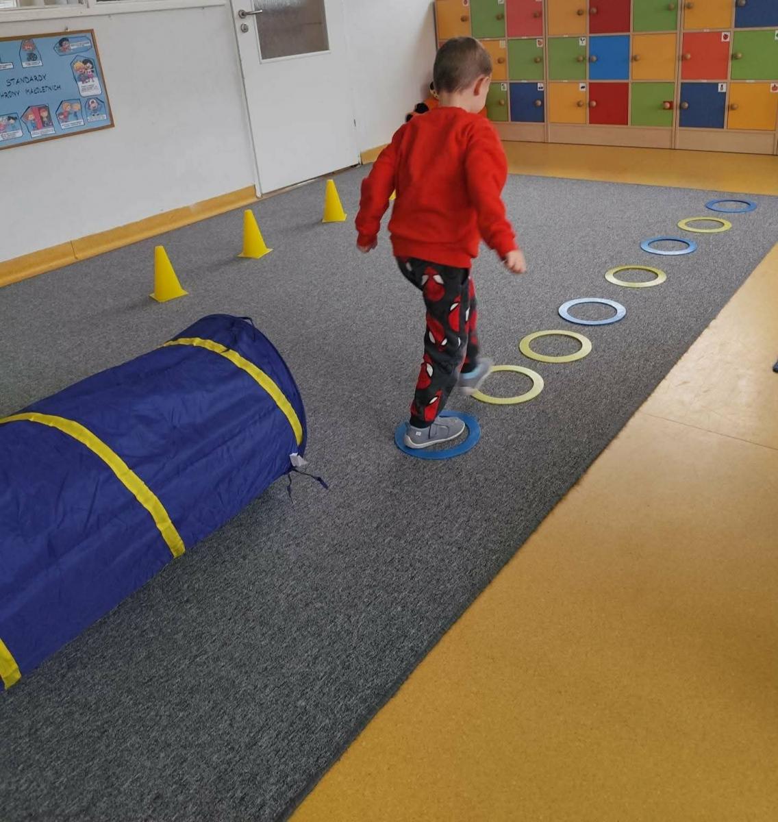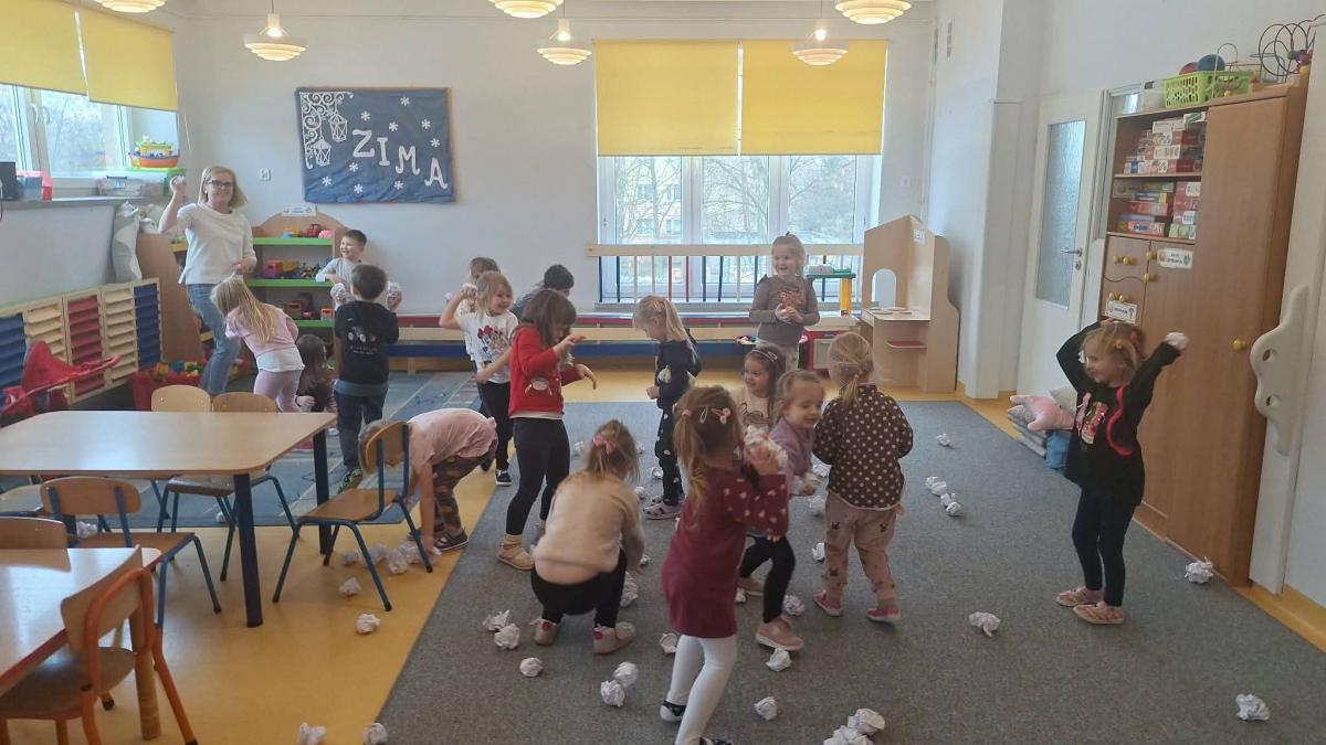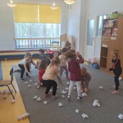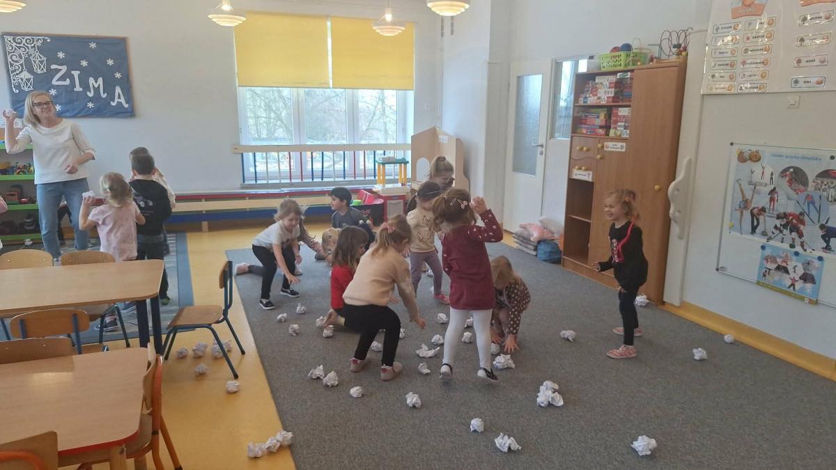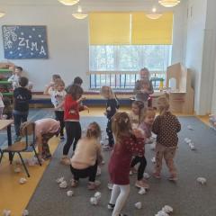 W grupach „Pszczółek” i „Słoneczek” odbyła się wesoła zabawa. Dzieci brały udział w wielu konkurencjach m.in. w nakładaniu oraz ściąganiu szalików i rękawiczek, naśladowaniu zimowych zabaw na śniegu oraz pokonywaniu toru przeszkód.