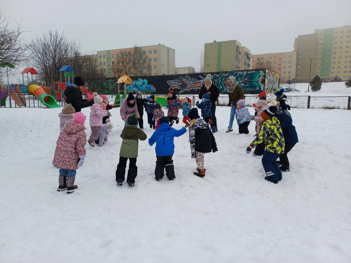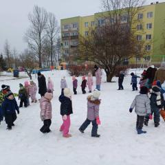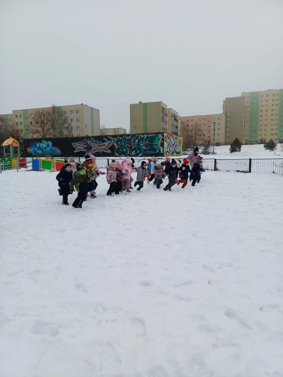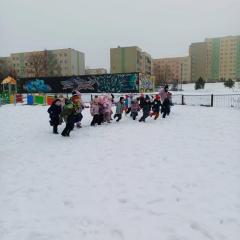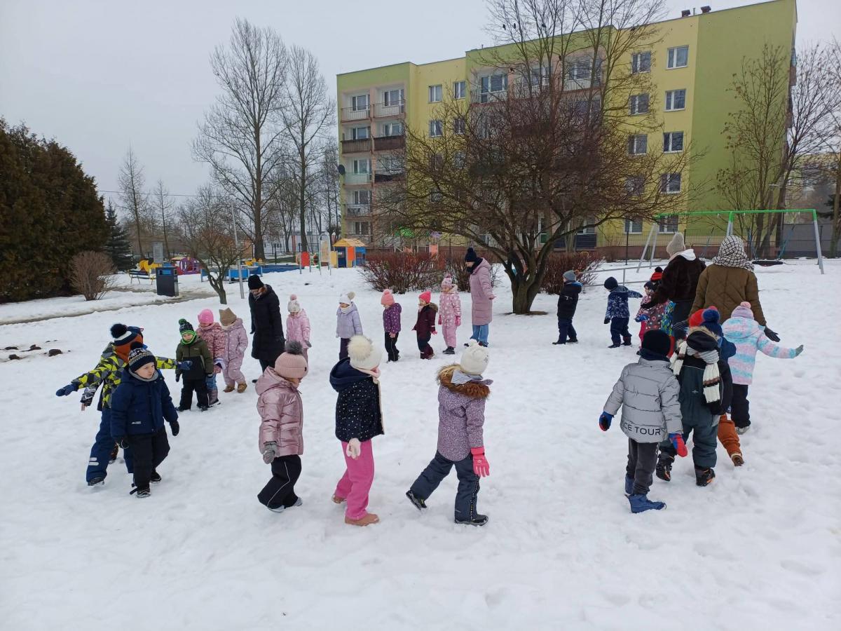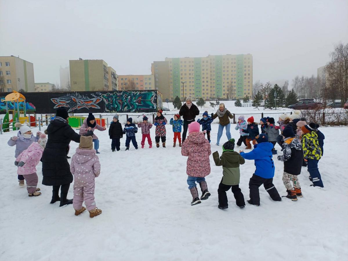 Dzieci z grup „Borówki” i „Skrzaty” wzięły udział w zimowych ćwiczeniach na świeżym powietrzu. W programie znalazły się m.in. skok w dal na śniegu, chodzenie jak pingwin, bieg oraz zabawa ruchowa „Skoki narciarskie”.