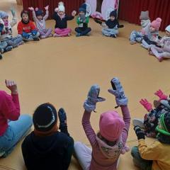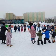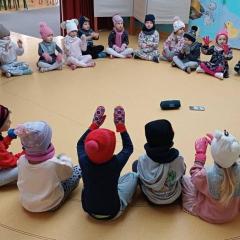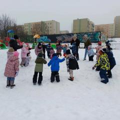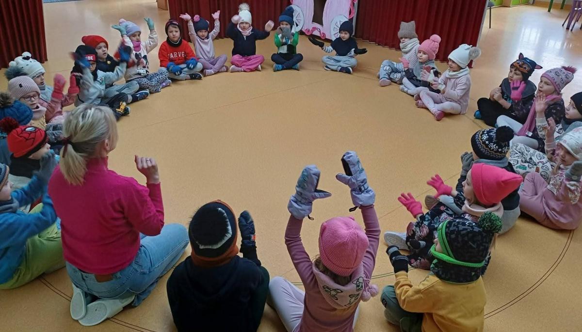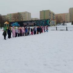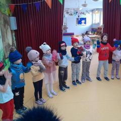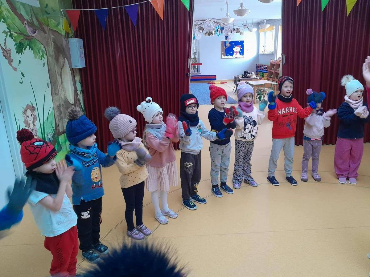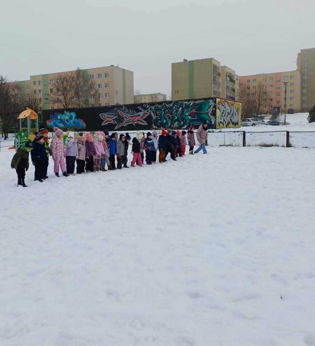 Dzieci z grup „Borówki” i „Skrzaty” wzięły udział w zimowych ćwiczeniach na świeżym powietrzu. W programie znalazły się m.in. skok w dal na śniegu, chodzenie jak pingwin, bieg oraz zabawa ruchowa „Skoki narciarskie”.