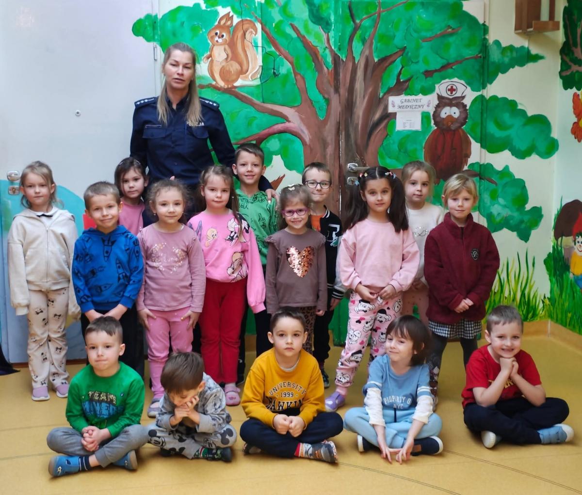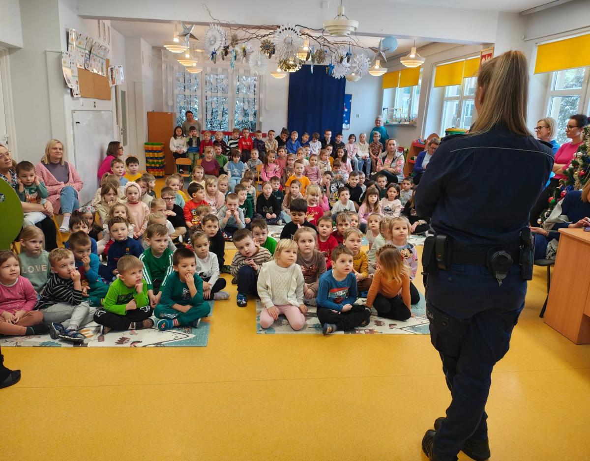 Pani policjantka w ciekawy i zrozumiały sposób przypomniała przedszkolakom najważniejsze zasady, które pomogą im bezpiecznie bawić się w czasie zimowego wypoczynku.
