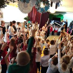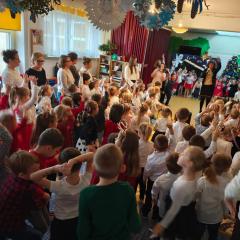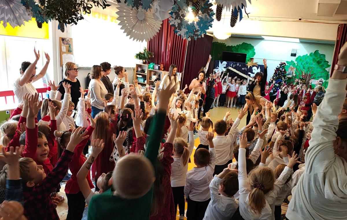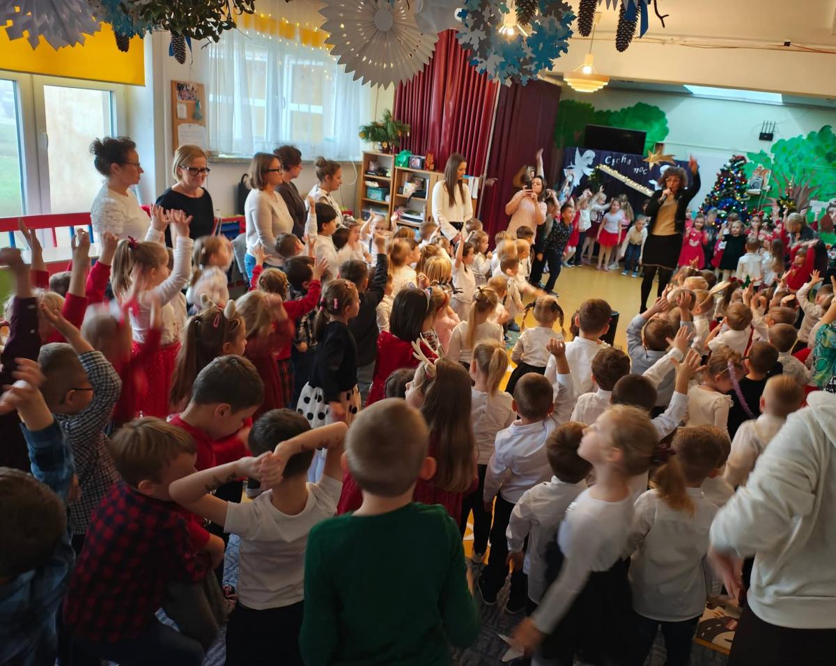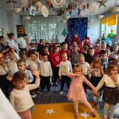 Na zakończenie całe przedszkole wspólnie odśpiewało „Przybieżeli do Betlejem pasterze”, a następnie – w tanecznym rytmie – bawiliśmy się przy świątecznej piosence „Feliz Navidad”, łączącej język hiszpański i angielski. Utwór został zaprezentowany przez grupy III i IV, przygotowane przez nauczyciela języka angielskiego p. Magdalenę Świercz.